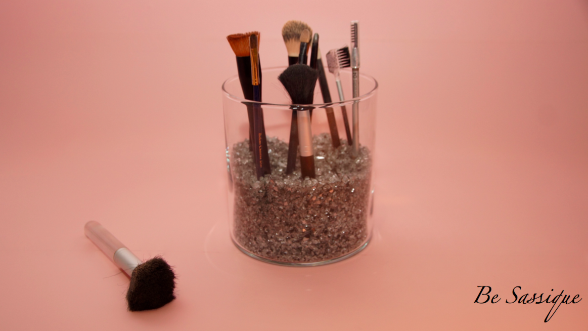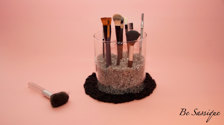 Ihr füllt die Denksteine/Spiegelsplitter ganz einfach so hoch ihr wollt in das Glas und steckt eure Pinsel hinein.